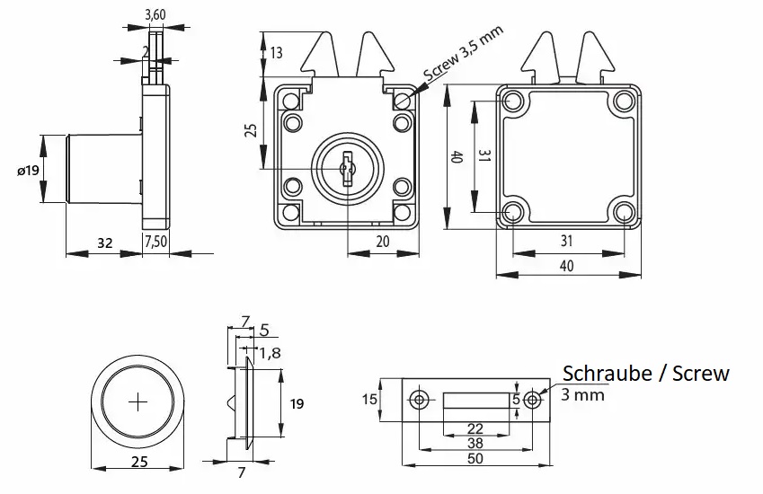 - The strike plate has two mounting holes with a diameter of ⌀3 mm