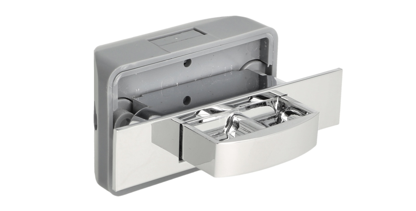 Exclusive push-button closure with soft-close damper 14.03.042-0, made of solid die-cast zinc, surface: chrome-plated, design: rectangular