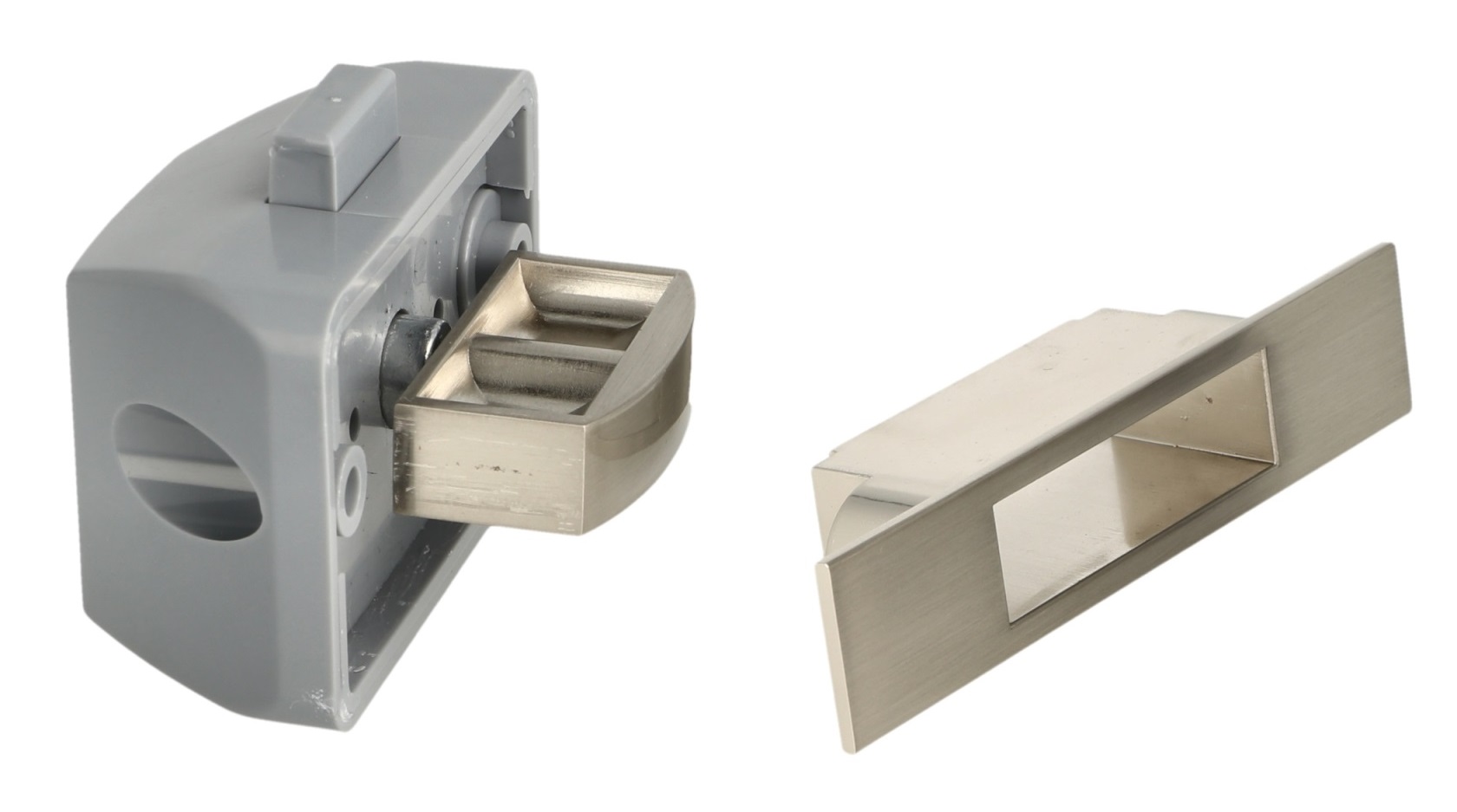 The special feature of the push-button fastener 14.03.044-0 is that the counterpart (strike plate) has two spring-loaded buffers. When closing, these buffers ensure that the door closes smoothly and does not make any noise while driving.
