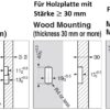 - Recommended screws: For wood mounting (thickness 25-29 mm): 4 x 15 mm Phillips flat-head self-tapping screws. For wood mounting (thickness from 30 mm): 4 x 20 mm Phillips self-tapping screws (for more details see