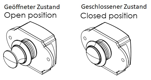 To open the furniture door, the handle of the push-button lock 14.03.047-0 must be pressed and thus released. The push button 14.03.047-0 serves as a practical handle with a length of 14 mm (35/64″) when opened. The special feature of the push-button fastener 14.03.047-0 is that the counterpart (strike plate) has two spring-loaded buffers. When closing, these buffers ensure that the door closes smoothly and does not make any noise while driving. These features make the 14.03.047-0 snap fastener perfect for private ships, planes, motorhomes and caravans.