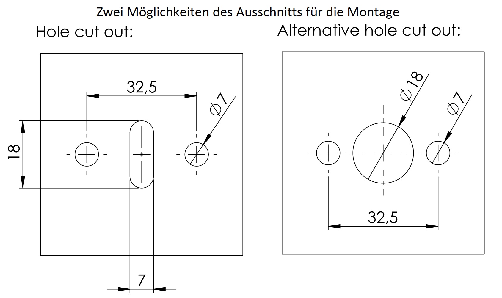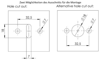 - For installation, a cut-out with a height of 18 mm (45/64″) and a width of 7 mm must be made in the front