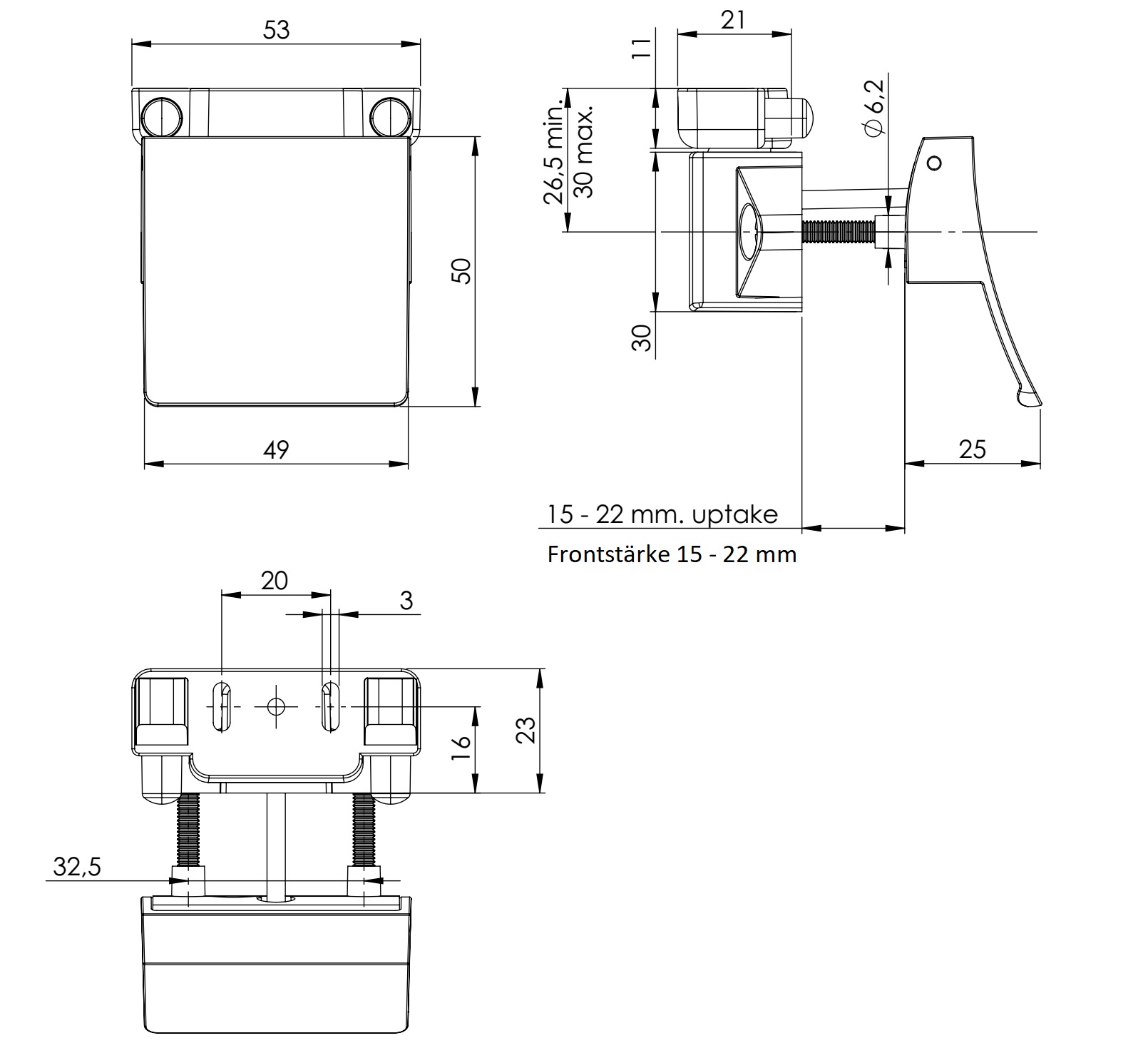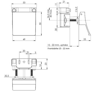 The lifting handle 14.03.075-0 is suitable for door thicknesses between 15 mm (19/32″) and 22 mm (55/64″).